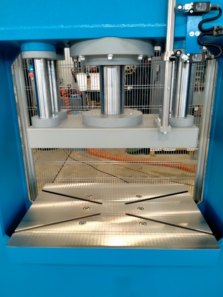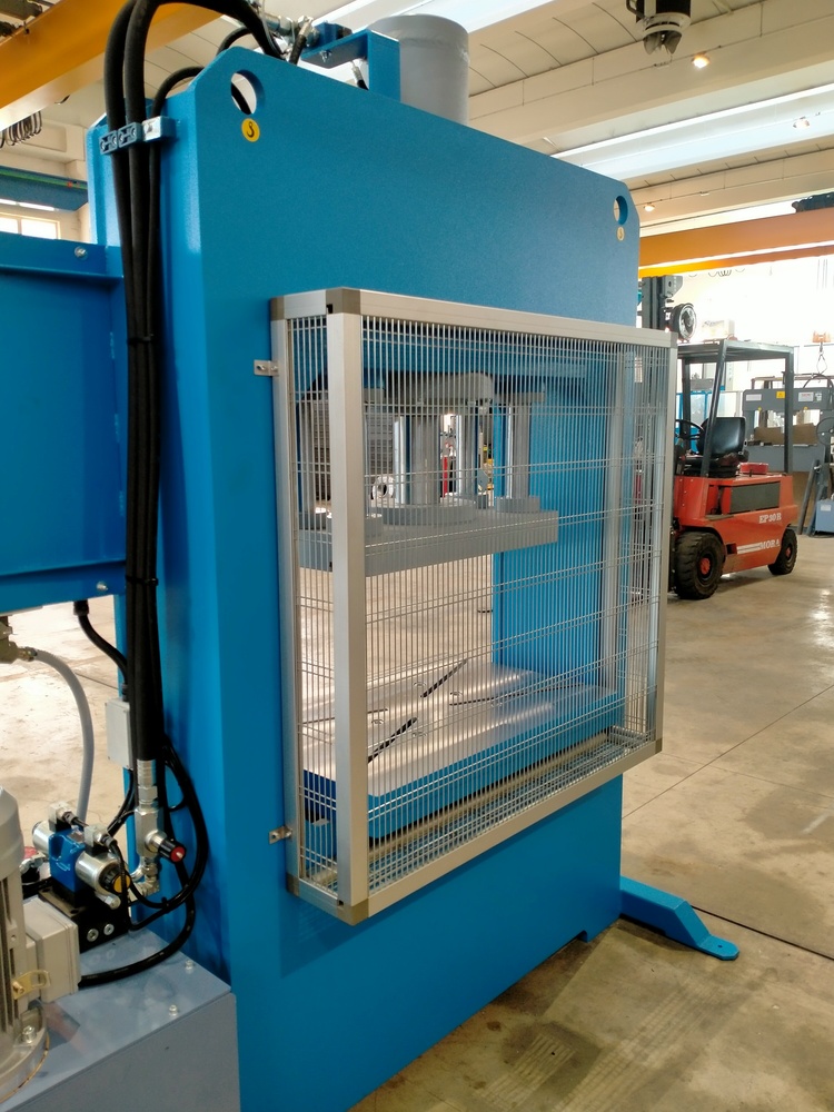 Questa pressa idraulica a doppia colonna sviluppa una potenza di 100 tonnellate e nella parte posteriore è protetta tramite rete metallica.