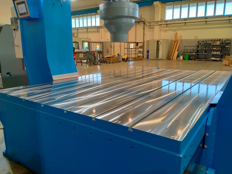 Il pianale di lavoro di 2500 x 4000mm è completamente fresato in superficie per garantire un ottimo parallelismo e ed è fornito di 6 cave a T con interasse di 350mm.