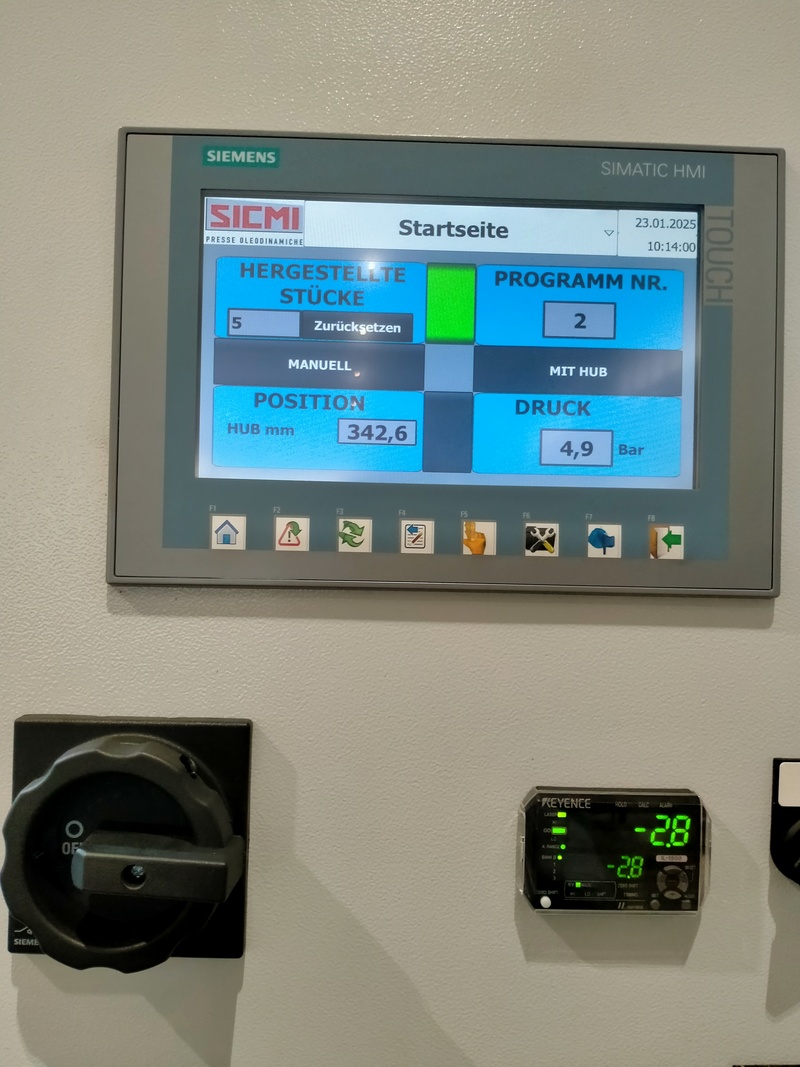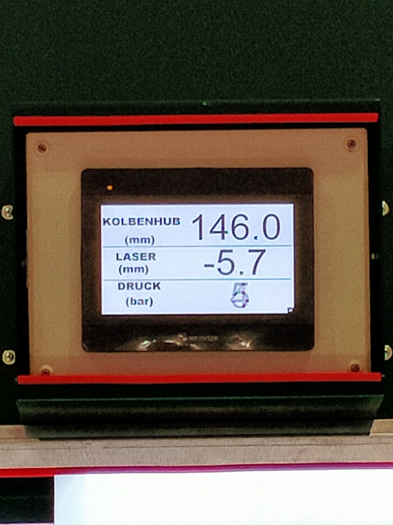 Un display digitale mostra in tempo reale la corsa del cilindro, la pressione esercitata in quel momento e il valore della deformazione del pezzo misurato dal laser.