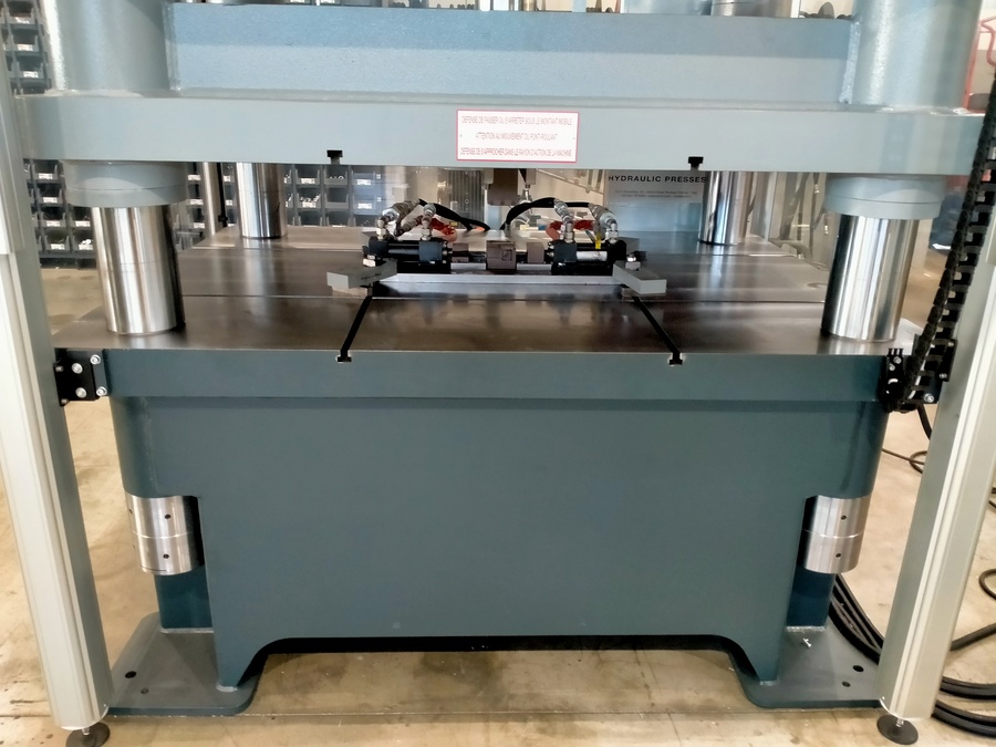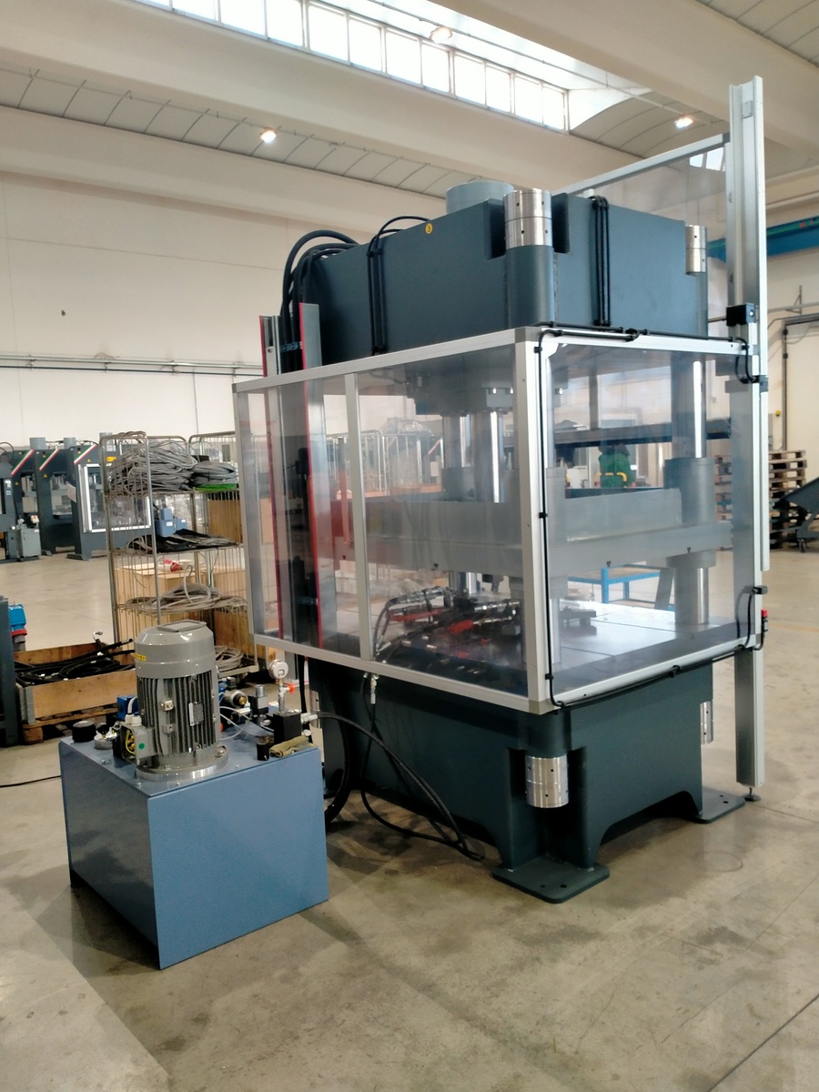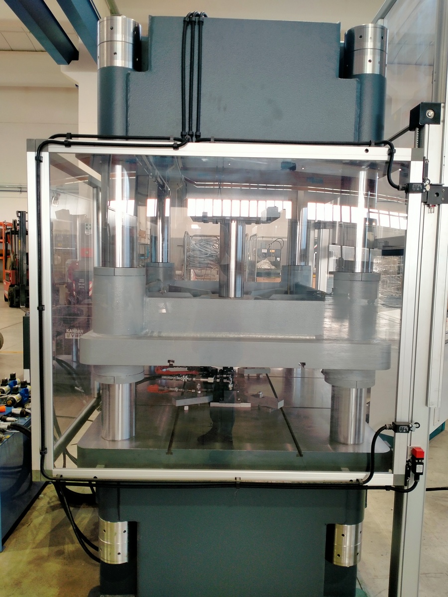 Questa pressa è stata completamente personalizzata per soddisfare le esigenze del cliente. La richiesta era infatti quella di avere una grande pressa da 150 tonnellate che potesse gestire l’utilizzo di due cilindri laterali ausiliari, il cui scopo è quello di tenere fermo il pezzo durante le fasi di pressatura.