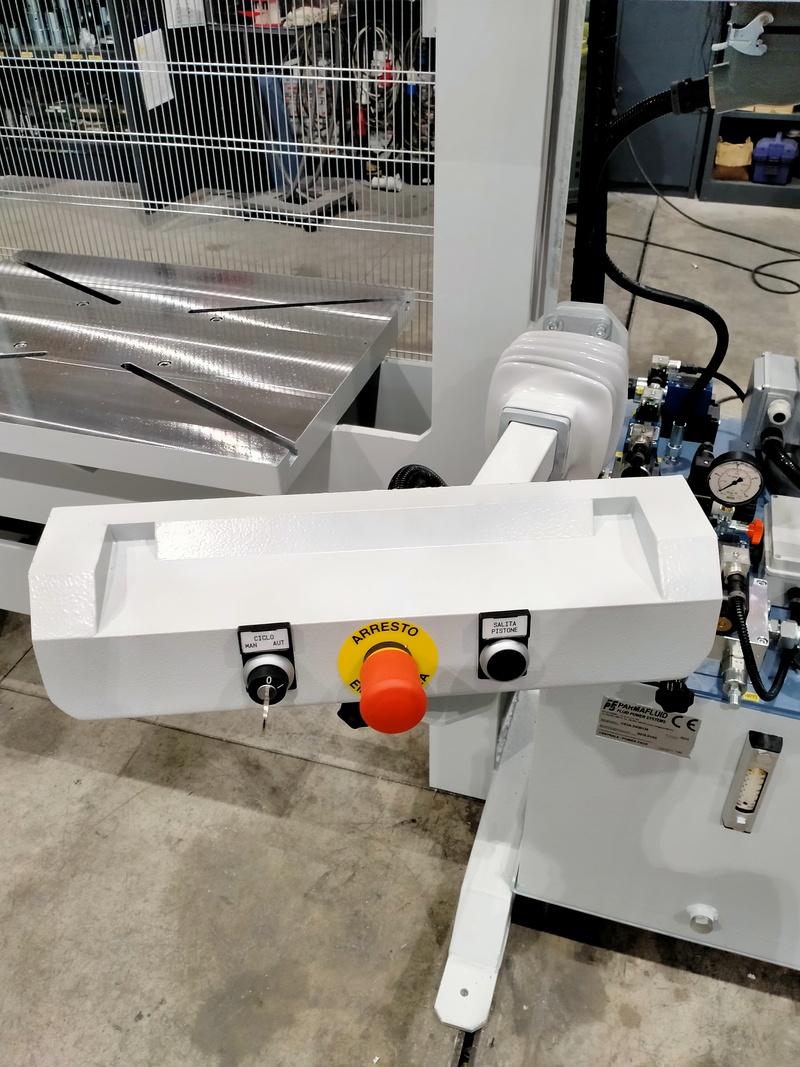 La console sulla quale sono inseriti i doppi pulsanti per l’azionamento della pressa è montata su una colonna laterale e ha uno snodo di 180°.
