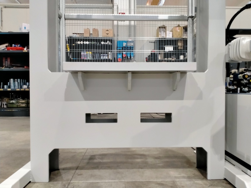 Sotto alla tavola inferiore di questa pressa idraulica a doppio montante per stampaggio sono presenti due feritoie, che agevolano lo spostamento della macchina all’interno dell’officina per mezzo di un carrello elevatore.