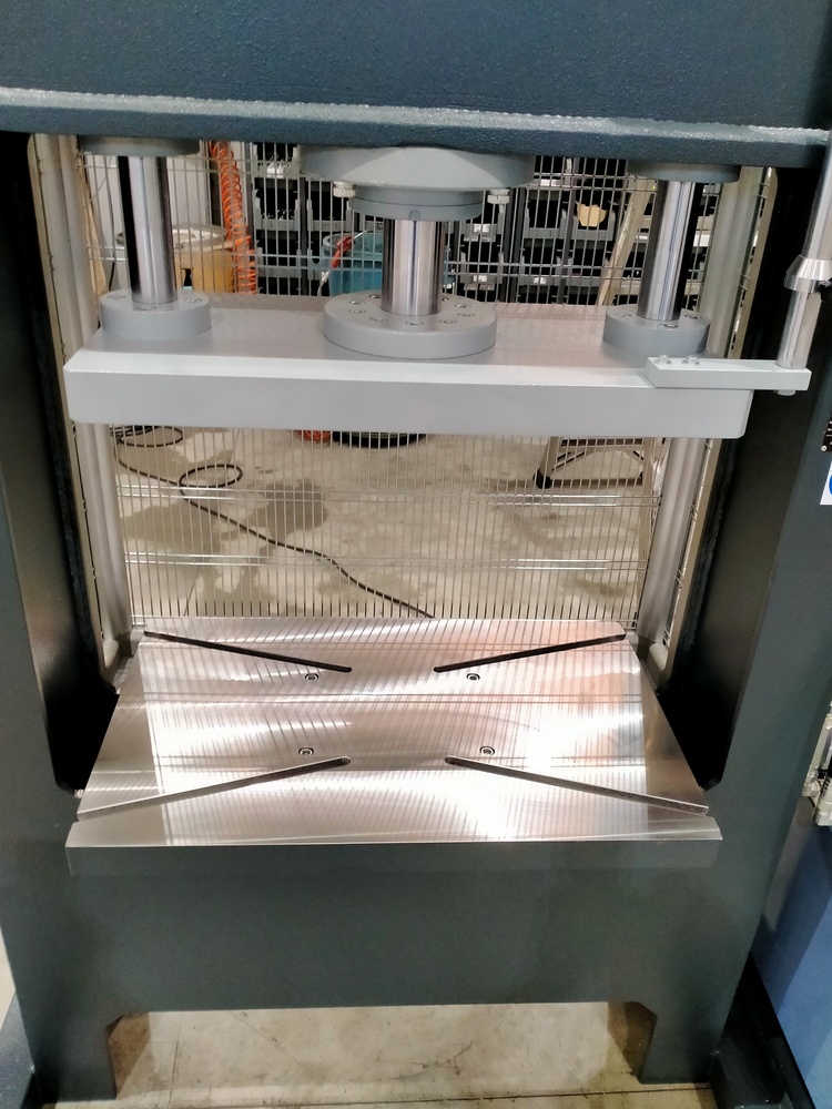 Questa pressa oleodinamica sviluppa una potenza di 40 tonnellate ed è fornita di un piano di lavoro completamente fresato e dotato di cave a T per il fissaggio degli stampi.