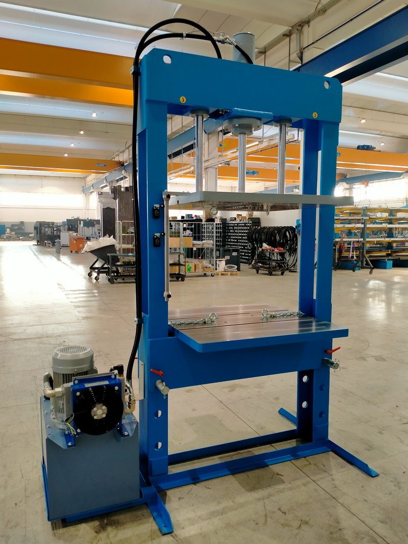 Su richiesta del cliente, la pressa è fornita senza l’impianto elettrico ed è stata verniciata con il colore blu RAL 5015.