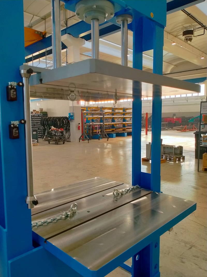 La pressa elettroidraulica sviluppa una potenza di 40 tonnellate ed è dotata di due ampie tavole completamente fresate in superficie delle dimensioni di 1000 x 1000mm.