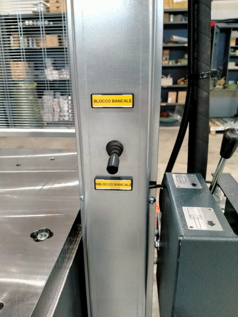 Questo accessorio opzionale è compatibile solo con la versione con spostamento manuale della tavola di lavoro. Se invece la pressa è equipaggiata con la piattaforma a movimentazione idraulica, il bloccaggio della tavola avviene invece idraulicamente.