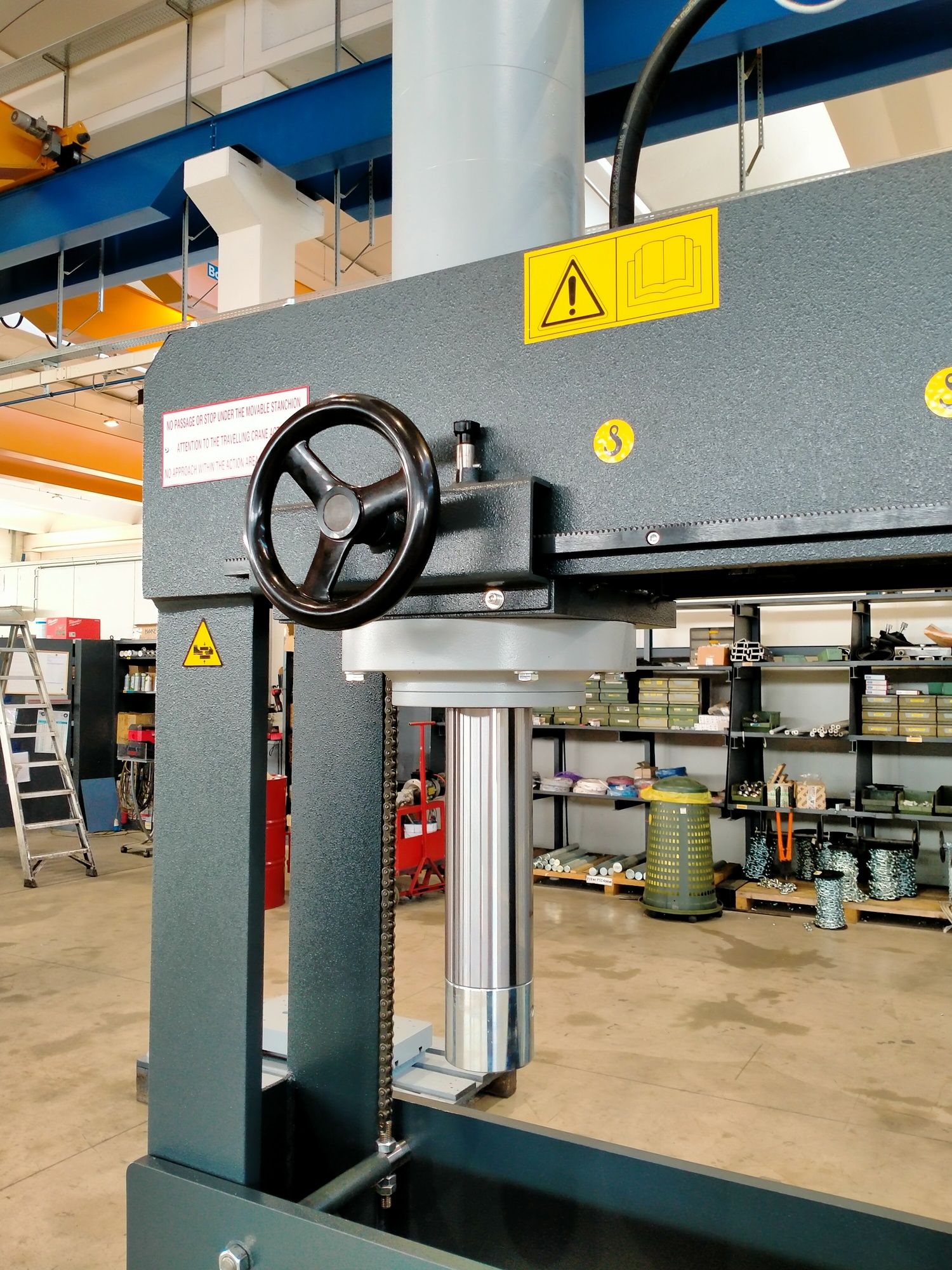 Pressa idraulica da officina motorizzata con spostamento oleodinamico del pianale e del cilindro, progettata per lavori di raddrizzatura o di deformazione della lamiera, per attività di stampaggio e per montaggi e riparazioni varie.
