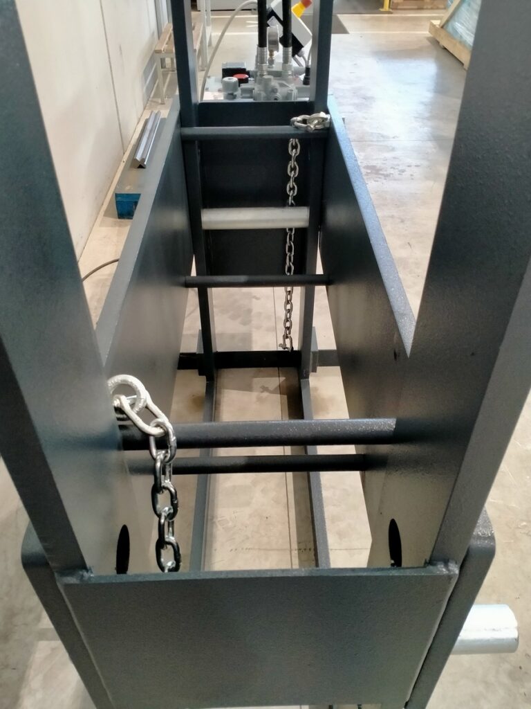Il sollevamento del pianale di lavoro avviene tramite catena da collegare al cilindro idraulico e il bloccaggio del piano di lavoro si effettua con l’utilizzo di tubi in acciaio, i quali eliminano eventuali movimenti indesiderati.