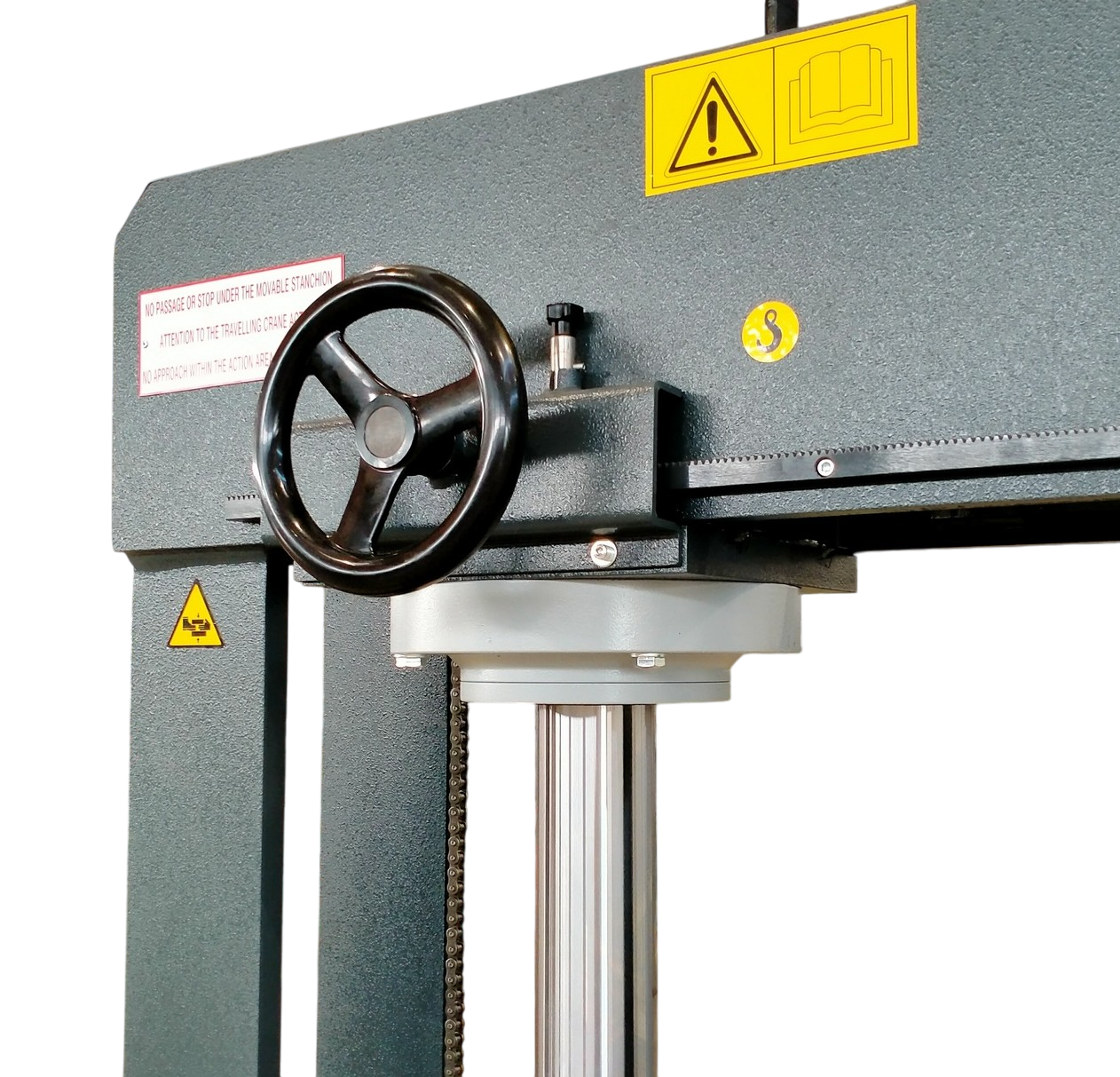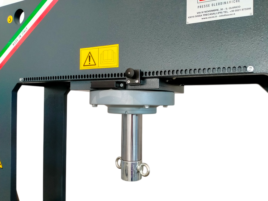 La pressa idraulica da officina PSS è disponibile anche con cilindro mobile a movimento trasversale con comando manuale. Questa funzione è molto utile perché permette di spostare il cilindro lateralmente e di farlo scendere successivamente sul punto esatto della lamiera su cui si vuole lavorare, senza dover movimentare il pezzo metallico.