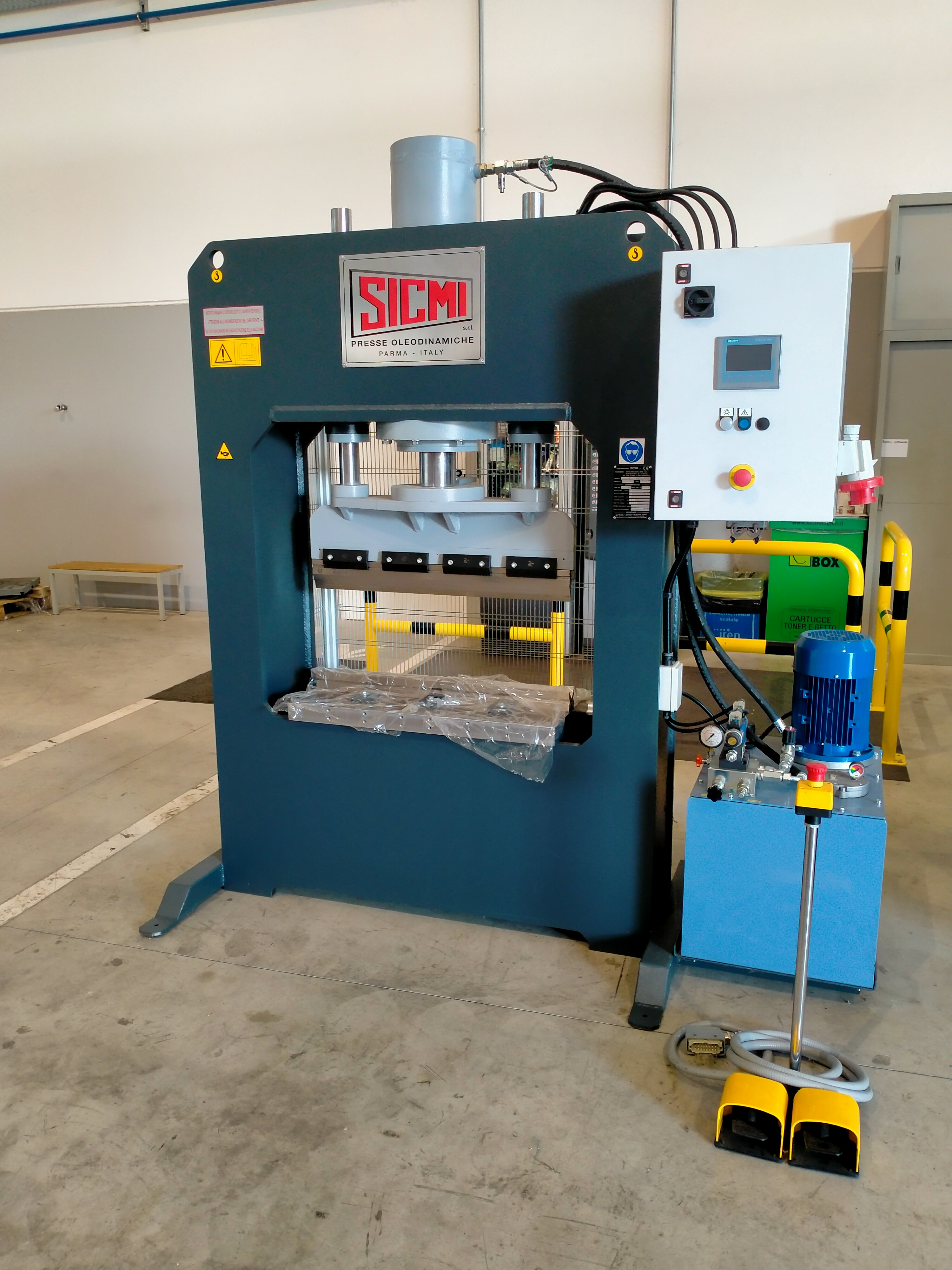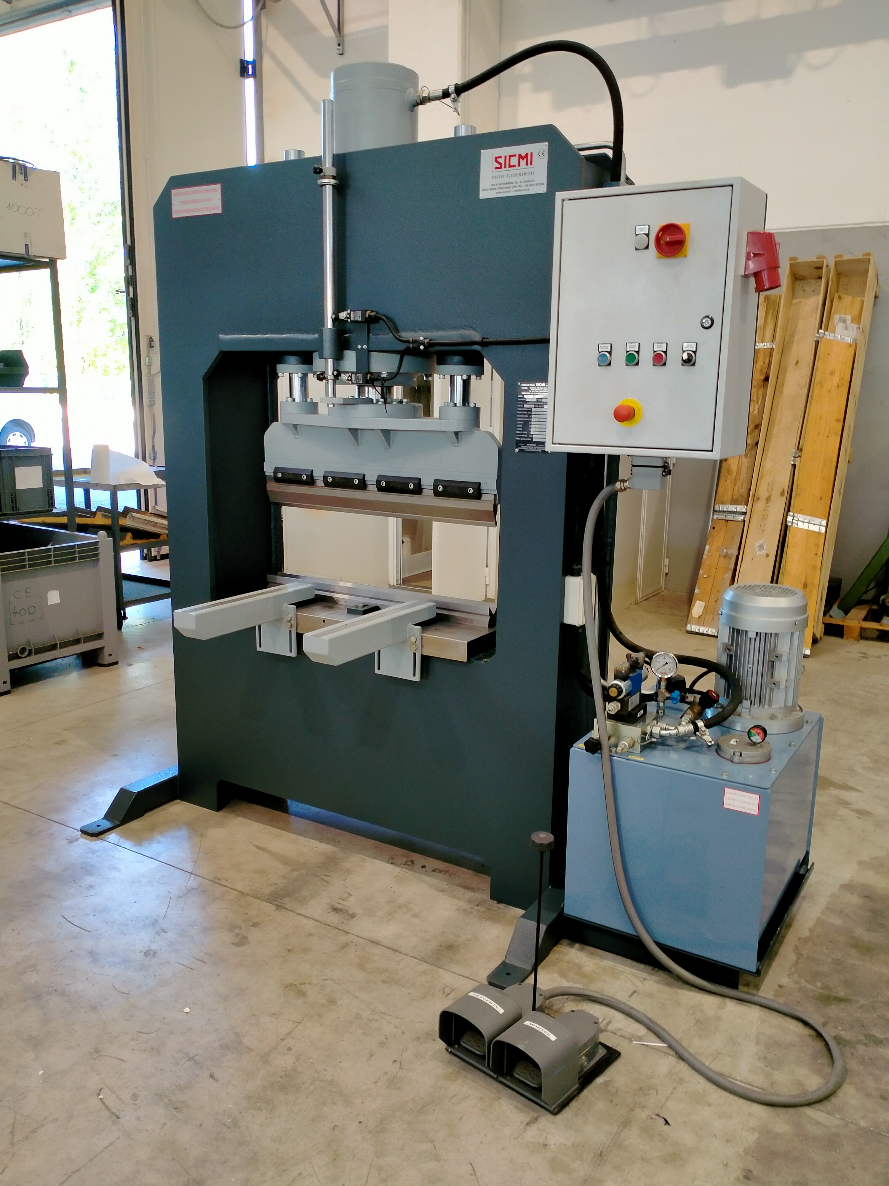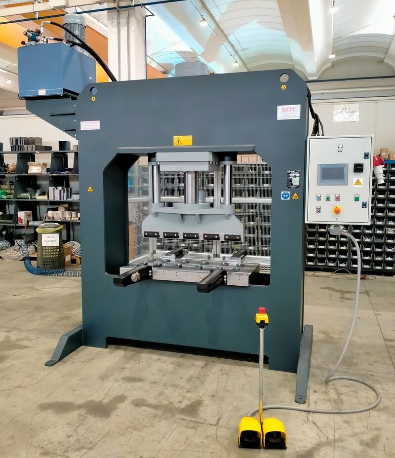 La macchina viene inoltre fornita con un pulsante di emergenza sulla pedaliera, oppure con un sistema anti-shock il quale blocca la pressa con l’aumento di pressione esercitato dal piede dell’operatore sul pedale.