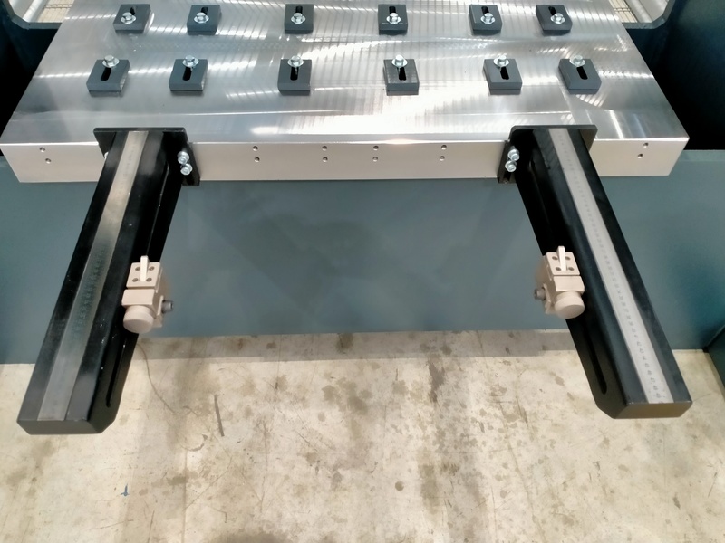 - Coppia di supporti anteriori con asta millimetrata e dotati di fermo con regolazione micrometrica per un fissaggio estremamente preciso della lamiera. (Forniti al posto della coppia di supporti anteriori, dati come dotazione standard)