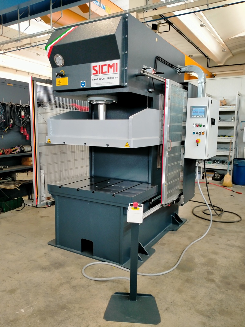 La pressa oleodinamica MCL ha una velocità di avvicinamento del cilindro principale fino a 125 mm/sec ed è provvista di un piano superiore mobile, il quale scorre lungo 4 guide e da un piano fisso inferiore, che è imbullonato alla struttura monolitica della pressa.