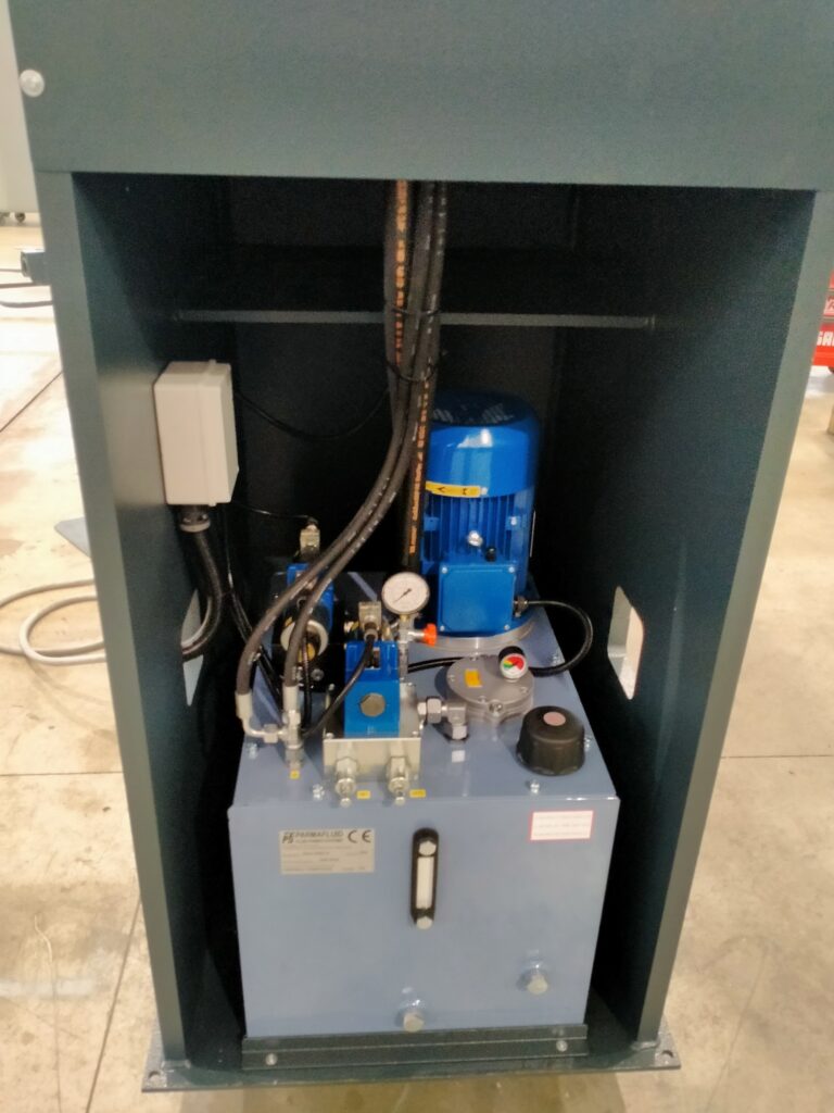 La centralina idraulica a due velocità è posizionata nel retro della pressa per ottimizzare gli spazi, mentre il quadro elettrico è installato su un lato del telaio.